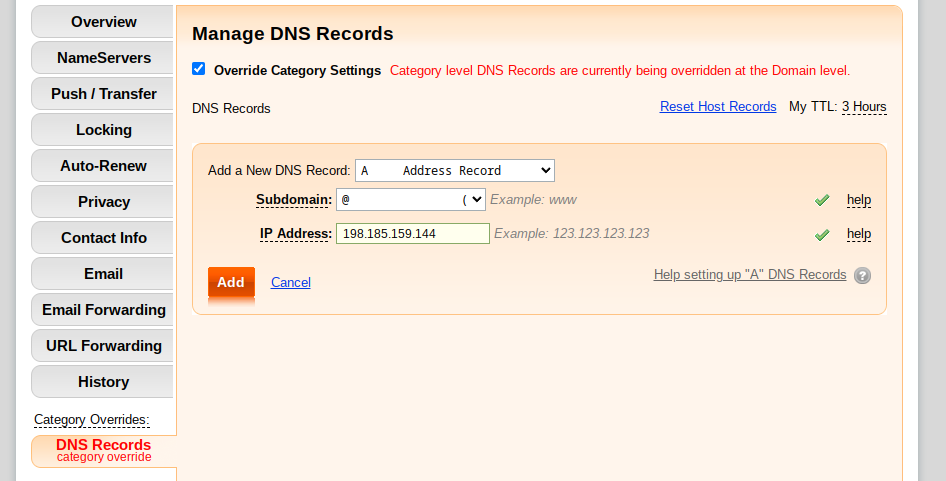 | @ (no subdomain) | A | 198.185.159.144 (You have already entered this one if you have followed the step above) |